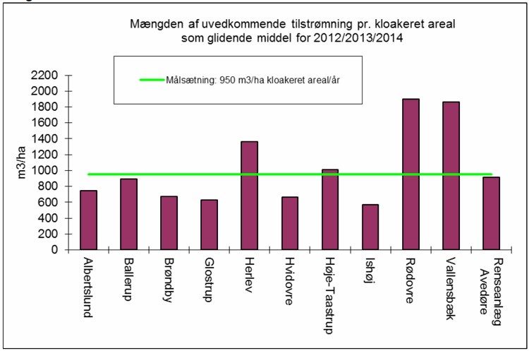 Uvedkommende vand må maksimalt udgøre 950 m3 /ha kloakeret areal /år beregnet som en glidende middelværdi over de seneste 3 år.